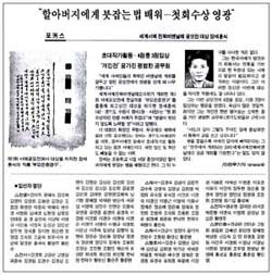 ¼¼°è¼¿¹ÀüºÏºñ¿£³¯·¹Á¶Á÷À§°¡ °³ÃÖÇÑ Á¦1ȸ ¼¿¹°ø¸ðÀü¿¡ ÇѱÛÀÛǰ 'ºÎ¸ðÀºÁ߰汸'¸¦ ÃâÇ°ÇØ ÃÖ°í»óÀÎ ´ë»óÀ» Â÷ÁöÇÑ Àå¼¼ÈÆ¾¾(42¡¤°æ±âµµ ¼ö¿ø½Ã ȼ1µ¿¡¤»çÁø)´Â "ù ȸ ¼ö»óÀÚÀÎ ¸¸Å ¾î±ú°¡ ¹«°Ì´Ù"¸ç "¿µ±¤ÀÌ ÇêµÇÁö ¾Êµµ·Ï ³ë·ÂÇÒ °Í" À̶ó°í ¸»Çß´Ù.