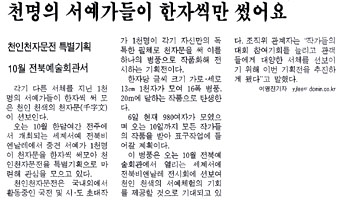 ¿À´Â 10¿ù ÇÑ´Þ¿©°£ ÀüÁÖ¿¡¼ °³ÃֵǴ ¼¼°è¼¿¹ ÀüºÏºñ¿£³¯·¹¿¡ ¼ Áß°ß ¼¿¹°¡ 1õ¸íÀÌ ÃµÀÚ¹®À» ÇÑÀÚ¾¿ ½á¸ð¾Æ õÀÎõÀÚ¹®ÀüÀ» Ư º°±âȹÀ¸·Î ¸¶·ÃÇØ °ü½ÉÀ» ¸ðÀ¸°í ÀÖ´Ù.