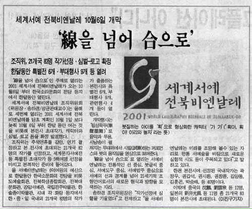 'àÊÀ» ³Ñ¾î ùêÀ¸·Î'ÀÎ ÁÖÁ¦·Î ¿¸®´Â 2001 ¼¼°è¼¿¹ ÀüºÏºñ¿£³¯·¹°¡ ¿À´Â 10¿ù 6ÀϺÎÅÍ Çѱ¹¼Ò¸®¹®ÈÀÇ Àü´ç µîÁö¿¡¼ ÇÑ´Þµ¿¾È ¿¸°´Ù. ¼¼°è¼¿¹ ÀüºÏºñ¿£³¯·¹ Á¶Á÷À§¿øÈ¸(À§¿øÀ塤¼ÛÇϰæ/¼º±Õ°ü´ë±³¼ö)´Â ¿ÃÇØ·Î ¼¼ ¹øÂ° ¿¸®´Â 2001 ¼¼°è¼¿¹ ÀüºÏºñ¿£³¯·¹¸¦ ´çÃÊ °èȹÀÎ 10¿ù 1ÀÏ º¸´Ù ´ÊÃç 10¿ù 6ÀϺÎÅÍ ÇÑ´Þ µ¿¾È ¿©´Â °ÍÀ» ºñ·ÔÇØ º»Àü½Ã ÃÊ´ëÀÛ°¡, ij¸¯ÅÍ¿Í ½É¹ú, ·Î°í µîÀ» È®Á¤ ¹ßÇ¥Çß´Ù. Á¶Á÷À§´Â Ãß¼®¿¬ÈÞ¸¦ °¨¾È, ¿¬±â °áÁ¤ÇÏ°í º» Àü½Ã¿¡ ÃÊ´ëµÇ´Â 21°³±¹ 82¸íÀÇ ÀÛ°¡¸¦ ¼±Á¤Çϰí, ¼¼°è¹®ÀÚ¼¿¹Àüµî Ưº°Àü ÃÊ´ëÀÛ°¡ µî 5¹é¿©¸í ¼±Á¤À» ¸¶Ä¡°í º»°ÝÀûÀÎ Áغñ¿¡ µé¾î°¬´Ù. ¿Ã ¼¿¹ºñ¿£³¯·¹´Â 6¾ï¿©¿øÀÇ ¿¹»êÀ¸·Î ÇÑ´Þµ¿¾È Çѱ¹¼Ò¹®ÈÀÇ Àü´çÀ» ºñ·Ô µµ¿¹¼úȸ°ü, ÀüºÏÇлýÁ¾ÇÕȸ°ü, ÀüºÏ´ë¹®È°ü, °¾Ï¼¿¹°ü, ±¹¸³ÀüÁÖ¹Ú¹°°ü, ÇѼÖÁ¾À̹ڹ°°ü, ½Ã³» °¢ ȶû µîÁö¿¡¼ ÇÑ¡¤Áß¡¤ÀÏ ±¹³»¿Ü 21°³±¹ 83¸íÀÇ ÀÛ°¡°¡ ÃâǰÇÏ´Â º»Àü½Ã¿Í Ưº°Àü 6°³, ºÎ´ëÇà»ç 9°³, °ü·ÃÇà»ç 4°³ µîÀÌ ¿¸°´Ù. °³¸·Çà»ç´Â 'Çʼº¹¬¹«(ù¶á¢ÙøÙñ)'·Î À½¾Ç°ú ¹«¿ë, ½Ã³¶¼ÛÀÌ ÆîÃÄÁö´Â ¹«´ëÀ§¿¡¼ ½ÃÇÊ(ãËù¶)ÇÏ´Â ÆÛÆ÷¸Õ½º¿Í º×ÀÇ ¿òÁ÷ÀÓÀ» ¿µ»óÀ¸·Î º¸¿©ÁØ´Ù. 'àÊÀ» ³Ñ¾î ùêÀ¸·Î'·Î ¿¸®´Â ¼¿¹ºñ¿£³¯·¹´Â ÀüÅëÀûÀÎ ¼± Áß½É, º×±Û¾¾ Áß½É, ¼¿¹µµ±¸ Áß½É, ¼¿¹¹üÁÖ Áß½ÉÀ¸·Î ¼¿¹ÀÇ ¼±°ú °æ°è¸¦ ³Ñ¾î 21¼¼±âÀû Á¶Çü¾ð¾î·Î¼ÀÇ »õ·Î¿î Çü½Ä°ú ¹æÇâÀ» ¸ð»öÇÏ´Â ÀÚ¸®. ¼ÛÇϰæ Á¶Á÷À§¿øÀåÀº "ÀÛ°¡¼±Á¤¿¡ ½ÉÇ÷À» ±â¿ï¿´´Ù"°í ÀüÁ¦Çϰí "¿Ã ¼¿¹ºñ¿£³¯·¹´Â ¹Ì·¡¸¦ Á¶¸ÁÇØ º¼¼ö ÀÖ´Â ÀÚ¸®·Î ÀüÅë ¼¿¹¼úÀ» ¹ÙÅÁÀ¸·Î »õ·Î¿î ½ÇÇèÀû ½Ãµµ µîÀÌ ÁÖ¸ñµÇ°í ÀÖ´Ù"°í ¸»Çϰí ÀÖ´Ù. ÇÑÆí º»Àü½Ã¿¡ ¼±Á¤µÈ ±¹³»ÀÛ°¡´Â °ûÁ¤¿ì, ±Ç°©¼®, ±Ç½Ãȯ, ±Çâ·û, ±è¾çµ¿, ±èÈÆ°ï, ¹Ú½Â¹è, µî 40¸íÀÌ´Ù. À̹ۿ¡ Áß±¹ÀÇ ä¡Ýß, êåê£ô» µî 12¸í ÀϺ»ÀÇ ãæïÌÎÃù¦ µî 11¸í ÃÑ 21°³±¹ 83¸íÀÌ º»Àü½Ã¿¡ ÃÊ´ëµÈ´Ù. |