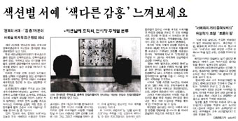 | ÀÌ·¯ÇÑ ÁÖÁ¦º° ºÐ·ù °¨»óÀº µµ¹ÎµéÀº ¹°·Ð ´Üü·Î ºñ¿£³¯·¹¸¦ ã´Â °ü°´µé¿¡°Ô ¼¿¹¸¦ ÀÌÇØÇϴ â±¸¿Í ´õºÒ¾î ¼¿¹¼úÀ» ü°èÀûÀ¸·Î Á¢±ÙÇÒ ¼ö ÀÖ´Â ¹æ¹ý·ÐÀ» Á¦½ÃÇØ ÁØ´Ù. Á¶Á÷À§¿øÈ¸°¡ ³»³õÀº ÁÖÁ¦·Î º¸´Â 2001¼¼°è¼¿¹ÀüºÏºñ¿£³¯·¹´Â ¡âÀüºÏÀÇ ¼¿¹, ÀüºÏÀÇ ³ë·¡¸¦ ºñ·ÔÇØ ¡â¼¿¹·Î, ÈÇÕÀ¸·Î ¡â¼¿¹, ¾î¶»°Ô °¨»óÇÒ °ÍÀΰ¡ ¡âÇÑ´« °¡µæ ´ã°Ü¿À´Â ¼¼°èÀÇ ¹®ÀÚ ¡â»ýȰ ¼ÓÀ¸·Î ³ì¾Æµå´Â ¼¿¹¿¹¼ú ¡â¿¸° üÇè ÇöÀå, °ü¶÷°´µé¿¡ Ȱ¦ ¡âÇѱ¹ ¼¿¹ À̲ø¾î°¥ ÁÖ¿ªÀ» ã¾Æ¼ µî ÃÑ 7ºÐ¾ß´Ù. ¸ÕÀú 'ÀüºÏÀÇ ¼¿¹, ÀüºÏÀÇ ³ë·¡'¿¡´Â ¿À´ÃÀÇ ÀüºÏ ¼¿¹Àü°ú ¾Æ¸§´Ù¿î ÀüºÏÀÌ ÃÊ´ëµÆ´Ù. ÀüºÏ ¼´ÜÀÇ ¿ª»ç¸¦ ÇÑÀÚ¸®¿¡¼ Á¶¸ÁÇϰí ÀüºÏ ¼´ÜÀÇ ¹Ì·¡¸¦ ¿¾î °¡´Â ÀÚ¸®·Î ÀüºÏ ¼¿¹°¡µéÀÇ ´Ù¾çÇÑ ÀÛǰÀ» ¸¸³¯ ¼ö ÀÖ´Ù. ¾Æ¸§´Ù¿î ÀüºÏ »êÇϸ¦ ³ë·¡ ÇÑ ½Ã¿Í ±×¸², ±×¸®°í ¼¿¹¼úÀ» µ¡´ë¾î Á¾ÀÌ À§¿¡ ÆîÃÄÁö´Â ȯ»óÀûÀÎ ¹ÌÀÇ ¼¼°è¸¦ °¨»óÇÏ´Â ÀÚ¸®´Ù. ¶Ç '¼¿¹·Î, ÈÇÕÀ¸·Î'´Â '¼±À» ³Ñ¾î ÇÕÀ¸·Î'¶ó´Â ÁÖÁ¦¸¦ °¡Àå ¼±¸íÇÏ°Ô ºÎ°¢½Ãų ¼ö ÀÖ´Â ÇÁ·Î±×·¥ÀÌ´Ù. µ¿¾Æ½Ã¾Æ ÇÑÀÚ¹®È±ÇÀÇ Á¤¼öÀÎ ¼¿¹¸¦ ¸Å°³·Î ¼¿¹°¡µéÀÇ ¿ìÁ¤°ú ÈÇÕÀ» ²ÒÇÏ°í °¢ ±¹ÀÇ ¼Ã¼¸¦ ºñ±³, °¨»óÇÒ ¼ö ÀÖ´Ù. ÀÌ ºÐ¾ß·Î´Â º» Àü½Ã¿Í ÇöÀå ½Ã¹üÈÖÈ£, ±¹Á¦Çмú´ëȸ, µ¿¾Æ½Ã¾Æ Æ÷·³ µî Çй®Àû Åä´ë°¡ ±»°ÇÇÏ´Ù. ¿©±â¿¡ '¼¿¹, ¾î¶»°Ô °¨»óÇÒ °ÍÀΰ¡'´Â ¼¿¹ÀÇ ´Ù¾çÇÑ Çʹý°ú ÀÛ°¡µéÀÇ ÀÛǰ¼¼°è¸¦ ÀÌÇØÇÏ´Â ±âº»ÀûÀÎ ´ÜÃʸ¦ Á¦°øÇÏ´Â Àü½Ã´Ù. 'ÀÛ°¡¿ÍÀÇ ¸¸³²'°ú '¸¸¹ý±ÍÀÏ'·Î ±¸¼ºµÈ ÀÌ Äڳʴ ¼¿¹°¡¿Í °¨»óÀÚµéÀÇ ±³°¨À» À̾îÁÖ°í ÀÖ´Ù. 'ÇÑ´« °¡µæ ´ã°Ü¿À´Â ¼¼°èÀÇ ¹®ÀÚ'´Â Àηù°¡ ÀÇ»ç ¼ÒÅë°ú ±â·ÏÀÇ ¿ª»ç¸¦ °®°Ô µ· °ÍÀº ¹®ÀÚÀÇ ¹ß°ß¿¡¼ ºñ·ÔµÇ¾úÀ½À» ³íÁõÇØÁÖ°í ÀÖ´Ù. ¼¼°è¹®ÀÚ ¼¿¹Àü°ú ±¹Á¦¹®ÀÚ°¢ÀüÀ¸·Î °ñ°ÝÀ» ÀÌ·é ÀÚ¸®´Â ¼¿¹ÀÇ ±¹Á¦È¸¦ µµ¸ðÇß´Ù. À̹ۿ¡ '»ýȰ ¼ÓÀ¸·Î ³ì¾Æµå´Â ¼¿¹¿¹¼ú'°ú '¿¸° üÇè ÇöÀå, °ü¶÷°´µé¿¡°Ô Ȱ¦'¿¡´Â ¿¬ÇÏÀå ¼¿¹Àü°ú õÀÎõÀÚ¹®Àü, µµÀü, °ü¶÷°´ ÈÖÈ£ÀüÀÌ °¢°¢ ¼±Á¤µÆ´Ù. ±×·¯³ª ¼¿¹ºñ¿£³¯·¹ÀÇ ¹Ì´öÀº ±â³ä °ø¸ðÀüÀ» ÅëÇØ Çѱ¹ ¼¿¹ÀÇ ÁÖÀΰøÀ» ã¾Æ ³ª¼± 'Çѱ¹ ¼¿¹ À̲ø¾î°¥ ÁÖ¿ªÀ» ã¾Æ¼'¶õ ÁÖÁ¦ÀüÀ̶ó ÇÒ ¼ö ÀÖ´Ù. »ö¼Çº°·Î °ñ¶óº¸´Â Àç¹Ì´Â ¼¿¹ÀÇ »ö´Ù¸¥ °¨ÈïÀ» Àü´ÞÇØÁÙ »Ó ¾Æ´Ï¶ó ¿Ã ¼¿¹ºñ¿£³¯·¹ÀÇ Æ¯Â¡À¸·Î ÀÚ¸®Àâ°í ÀÖ´Ù.