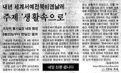 2003¼¼°è¼¿¹ÀüºÏºñ¿£³¯·¹ÀÇ ÁÖÁ¦´Â ¡®»ýȰ(ßæüÀ)¼ÓÀ¸·Î¡¯. 2003³â 9¿ù 20ÀϺÎÅÍ 10¿ù 19ÀϱîÁö ÇÑ ´Þ µ¿¾È