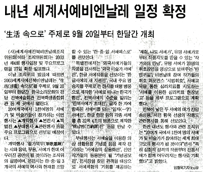 À̳¯ Á¶Á÷À§ÀÇ ¹ßÇ¥¿¡ µû¸£¸é 2003¼¼°è¼¿¹ÀüºÏºñ¿£³¯·¹´Â ¡®ßæüÀ(»ýȰ) ¼ÓÀ¸·Î¡¯¸¦ ÁÖÁ¦·Î 9¿ù 20ÀϺÎÅÍ ÇÑ ´Þ°£