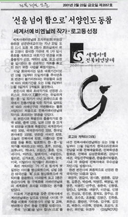 À̳¯ ȸÀÇ¿¡¼´Â ´çÃÊ ´ëȸ±â°£À̾ú´ø 10¿ù 1ÀϺÎÅÍ 31ÀϱîÁö¸¦ Ãß¼®¿¬ÈÞ·Î º¯°æÀÌ ºÒ°¡ÇÇÇÏ´Ù´Â À§¿øµéÀÇ ¿äû¿¡ µû¶ó ´ëȸ±â°£À» ¿À´Â 10¿ù 6ÀϺÎÅÍ 11¿ù 5ÀϱîÁö 1°³¿ù·Î °áÁ¤Çß´Ù. º»Àü½ÃÀÇ ÇØ¿Ü ÃÊ´ëÀÛ°¡·Î ¼±Á¤µÈ ½ºÀ§½ºÀÇ ¿ì·Á»ç(éÖÕòÞÞ)¾¾´Â À¯ÀÏÇÏ°Ô ÇÑ¡¤Áß¡¤ÀÏ ÀÛ°¡°¡ ¾Æ´Ñ ¿Ü±¹ÀÎÀ¸·Î Áß±¹¿¡¼ ÀüÅë¼¹ýÀ» ÀÍÈù ÀÛ°¡·Î ¾Ë·ÁÁü¿¡ µû¶ó ¼¿¹Àα¸ÀÇ Àúº¯È®´ë´Â ¹°·Ð ¼¾çÀÎÀÌ Ã³À½À¸·Î ÀüºÏ¼¿¹ºñ¿£³¯·¹ ÀÛ°¡·Î ÃÊ´ëµÇ´Â ¿µ±¤À» ¾È¾Ò´Ù. ¶Ç º»Àü½Ã¿Í Ưº°ÀüÀÇ ÃâǰÀÛ°¡·Î Çѱ¹ 40¸í, Áß±¹ 12¸í, ÀϺ» 11¸í µî 21°³±¹ 83¸íÀ» ºñ·ÔÇØ Ưº°ÀüÀÎ ¼¼°è¹®ÀÚ¼¿¹Àü 30¸í, ±¹Á¦¹®ÀÚ°¢Àü 33¸í, Çö´ëÀϺ»¼¿¹Àü 100¸í, ¿¬ÇÏÀå ¼¿¹Àü 82¸í, ¿À´ÃÀÇ ÀüºÏ¼¿¹ 81¸í, ¾Æ¸§´Ù¿î ÀüºÏ 93¸í µîÀ» È®Á¤, ¹ßÇ¥Çß´Ù. ÇÑ¡¤Áß¡¤ÀÏ ÀÛ°¡¸¦ Á¦¿ÜÇϰí´Â ´ë¸¸, È£ÁÖ, ºê¶óÁú, ºê·ç³ªÀÌ, ij³ª´Ù, ÇÁ¶û½º, È«Äá, Àεµ³×½Ã¾Æ, ¸¶Ä«¿À, ¸»·¹Áö¾Æ, ³×´ú¶õµå, Çʸ®ÇÉ, ½Ì°¡Æ÷¸£, ½ºÀ§½º, ű¹, ¿µ±¹, ¹Ì±¹, ÀÌÅ»¸®¾Æ ÀÛ°¡µéÀÌ ÃÊ´ëµÆ´Ù. ƯÈ÷ ij¸¯ÅÍ´Â '°¡°¡'·Î ÈûÂ÷°Ô º×ÁúÇÏ´Â ¾ÆÀ̸¦ Çü»óÈÇßÀ¸¸ç, ½É¹ú 2Á¾Àº űؼ±À» 'ȹ'À¸·Î Çü»óÈÇßÀ¸¸ç ij¸¯Å͸¦ ÀÀ¿ëÇß´Ù. ÀÌ¿ÍÇÔ²² ·Î°í 2Á¾Àº ¼Û°°¡»çü µî ±¸Ã¼ÈÇØ ¼¿¹ºñ¿£³¯·¹ÀÇ ¼¼°èÈ¿¡ Ãʼ®À» ´ÙÁ³´Ù´Â Æò°¡¸¦ ¹Þ¾Ò´Ù. ÀÌ·Î½á ±âº»°ñ°ÝÀ» °®Ãá ÀüºÏ¼¿¹¼¼°èºñ¿£³¯·¹´Â ¾ÕÀ¸·Î ÀÎÅÍ³Ý »çÀÌÆ® ±¸ÃàÀ» ºñ·ÔÇØ ÀÚ¿øºÀ»çÀÚ ¼±¹ß ¹× ±³À°, ºÎ´ëÇà»ç Áغñ µîÀ» ÁøÇàÇÒ ¹æÄ§ÀÌ´Ù. ÁÖÁ¦ '¼±(àÊ)À» ³Ñ¾î ÇÕ(ùê)À¸·Î'¸¦ ³»°Ç ÀüºÏ¼¿¹ºñ¿£³¯·¹´Â ¿À´Â 10¿ù 6ÀϺÎÅÍ 11¿ù 5ÀϱîÁö Çѱ¹¼Ò¸®¹®ÈÀÇ Àü´çÀ» ºñ·Ô ÀüºÏ¿¹¼úȸ°ü, ÀüºÏÇлýÁ¾ÇÕȸ°ü, ÀüºÏ´ë »ï¼º¹®Èȸ°ü, °¾Ï¼¿¹°ü, ±¹¸³ÀüÁÖ¹Ú¹°°ü, ÇѼÖÁ¾À̹ڹ°°ü, ½Ã³» °¢ ȶû¿¡ ÀüºÏ¼¿¹ÀÇ ¿ì¼ö¼ºÀ» °¢ÀνÃų ¹æÄ§ÀÌ´Ù. ÇÑÆí º»Àü½Ã¿¡ ÃÖÁ¾ÀûÀ¸·Î ¼±Á¤µÈ Çѱ¹ÀÛ°¡´Â ´ÙÀ½°ú °°´Ù. °ûÁ¤¿ì, ±Ç°©¼®, ±Ç½Ãȯ, ±Çâ·û, ±è¾çµ¿, ±èÈÆ°ï, ¹Ú½Â¹è, ¹Ú¿µÁø, ¹é¿µÀÏ, º¯¿µ¹®, ¼®¿ëÁø, ¼±ÁÖ¼±, ¼ÛÇö¼÷, ½Åµ¿¿±, ¾çÁø´Ï, ¾çÅõ¿, ¿©¿ø±¸, ÀÌÀº¼³, Àοµ¼±, Àü»ó¸ð, ÀüÁø¿ø, Á¤Á¦µµ, Á¤ÁÖ»ó, Á¤ÅÂÈñ, Á¶¼öÈ£, Á¶¿ëö, Áø¿µ±Ù, ÁøÇÐÁ¾, ÃÖµ·»ó, Ȳ¹æ¿¬, ±¸ÀÚ¼Û, ±è±¸ÇØ, ±èÁøÈñ, ¹éÇö¼ö, ÀÌÀºÇõ, Àü¸í¿Á, Á¶¼ºÀÚ, Á¶¿ë¼±, ÃֹηÄ, Çã°æ¹«